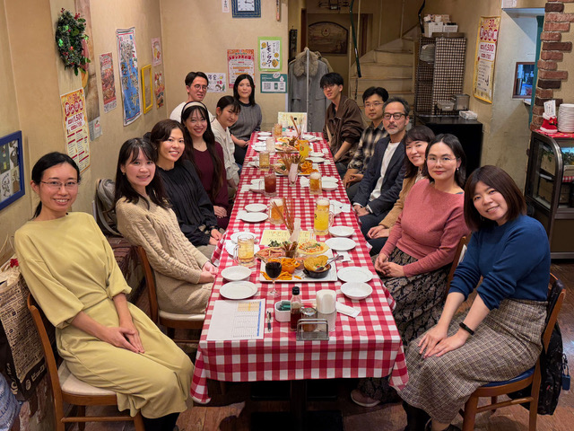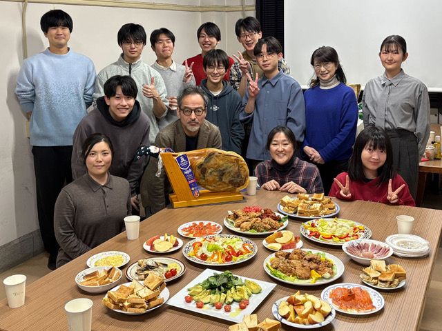 年末恒例の研究室のクリスマスパーティーを開きました。今年は生ハムの原木を仕入れて、切りたての生ハムを楽しみました。プレゼント交換も行って、大いに盛り上がりました。また、何人かの卒業生が集まってランチ会を開きました。皆さん、昔と変わらない笑顔を見せてくれました。今年も一年間、お疲れさまでした。